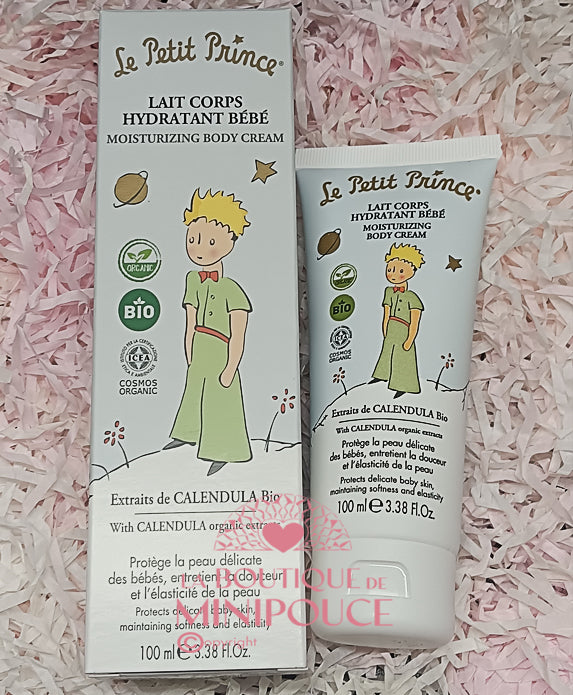 Aux extraits de calendula issus de l'agriculture logique, le lait corps hydratant Le Petit Prince, protège, hydrate et maintient la douceur naturelle de la peau de bébé. Ingrédients : Aqua, Aloe Barbadensis Leaf Juice*, Cetearyl Alcohol, Caprylic Triglyceride, Polyglyceryl-3 Stearate, Dicaprylyl Ether, Sodium Stearoyl Lactylate, Butyrospermum Parkii Butter*, Prunus Amygdalus Dulcis Oil*, Simmondsia Chinensis Seed Oil*, Calendula Officinalis Flower Extract*, Glycerin, Helianthus Anuus Seed Oil, Tocopherol, Xanthan Gum, Sodium phytate, Sodium Levulinate, Potassium Sorbate, Sodium Benzoate, Citric Acid, Parfum, Limonene. *Issu de l'agriculture logique.